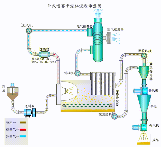 臥式噴霧干燥塔工作原理通常為:前處理生產(chǎn)形成的漿料,通過高壓泵加壓均質(zhì)從噴霧干燥塔上方的噴嘴霧化,與此同時利用進(jìn)風(fēng)機(jī)和排風(fēng)機(jī)將高溫空氣帶入塔內(nèi)將霧化的漿料的水分帶走,這樣就產(chǎn)生了干燥粉。整個干燥過程是一個準(zhǔn)確的能量交換,產(chǎn)品的含水量須在給料含水率、給料速率、進(jìn)風(fēng)溫度等其他條件改變時也保持一定允許的范圍之內(nèi)。噴霧干燥塔是用于生物農(nóng)藥,醫(yī)藥,食品微生物的干燥的設(shè)備。